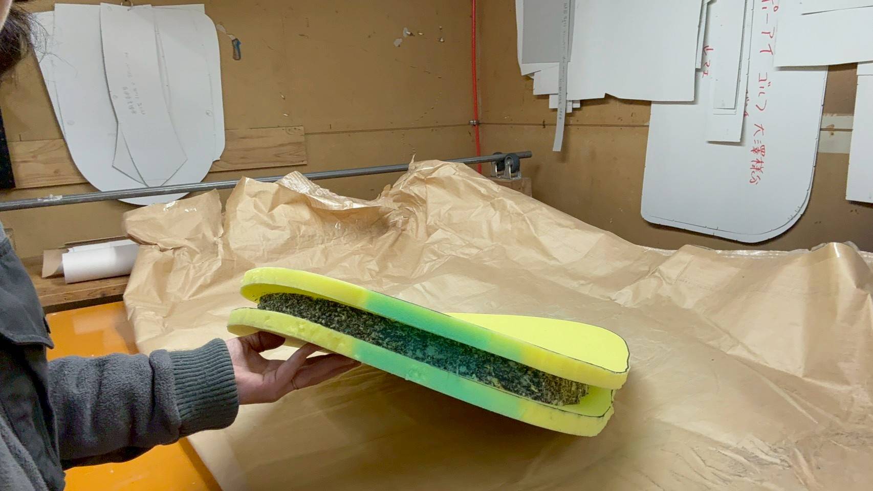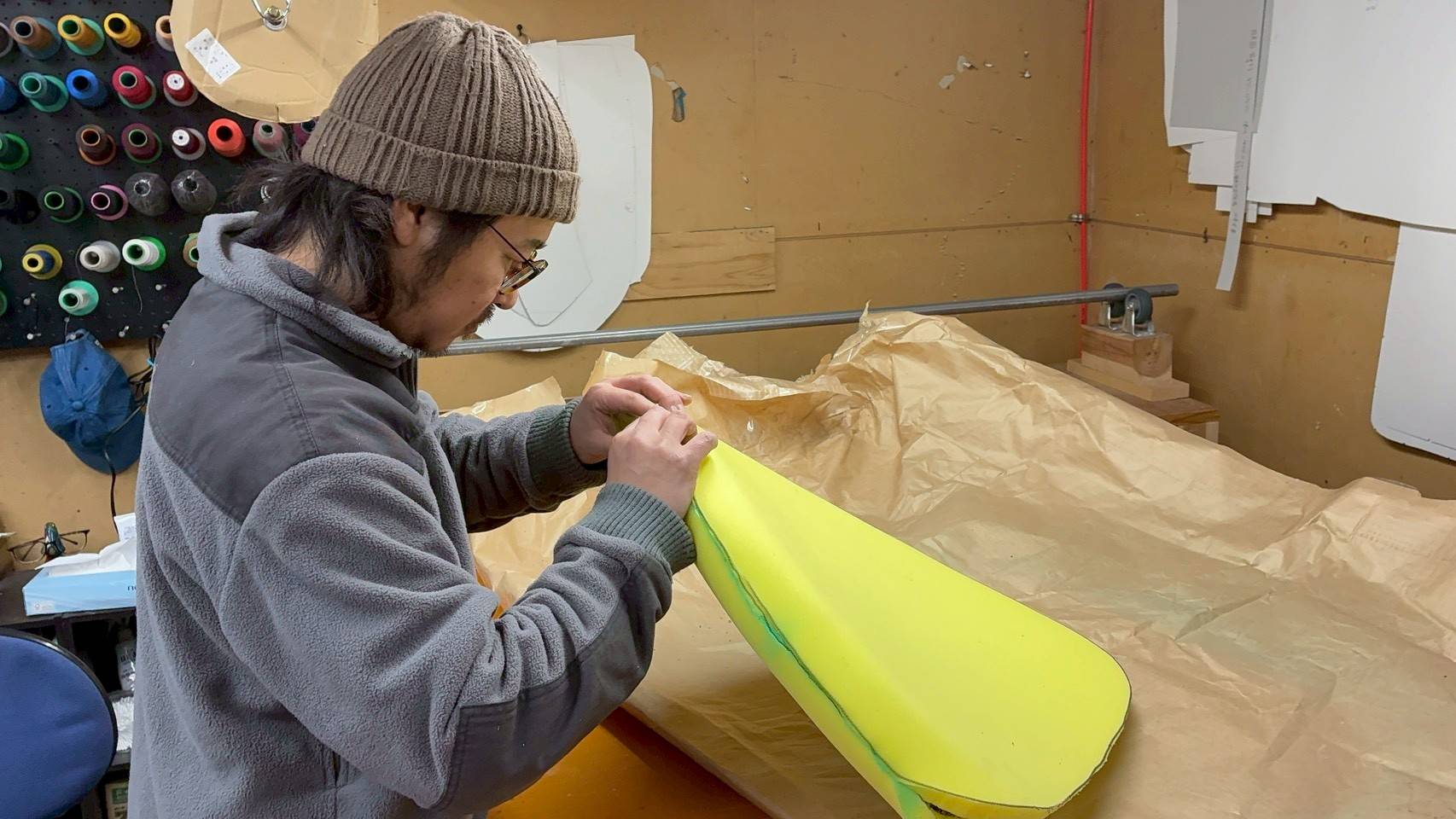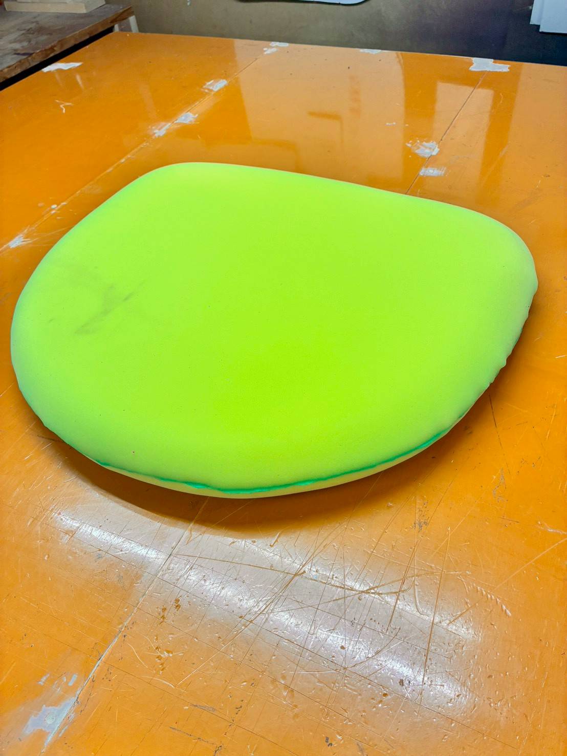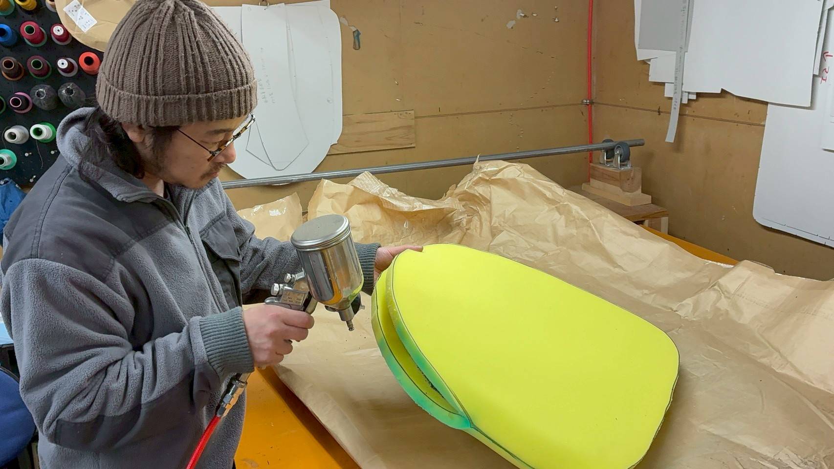 同時に座面のウレタンも1から作製していきます(緑色の箇所は専用のボンドを散布した跡です)